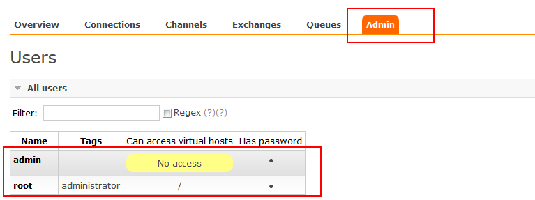 使用上面步骤中的用户名和密码登录并点击Admin标签,如图所示admin用户的权限未配置,root用户的配置是正确的。