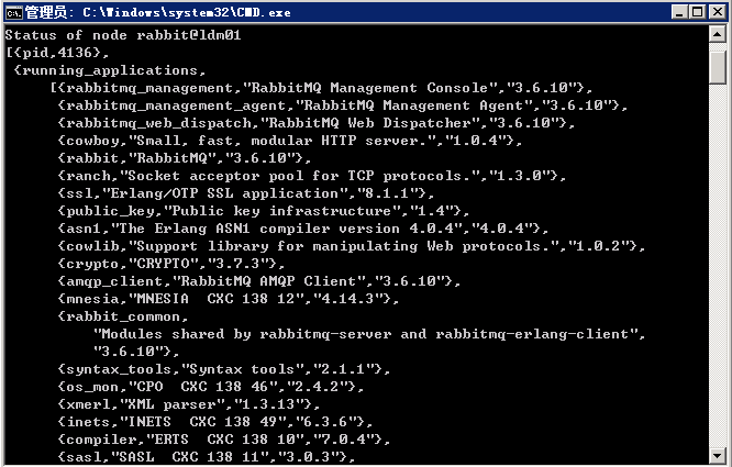 输入 rabbitmqctl status命令并执行,如果出现以下的图,说明安装是成功的,并且说明现在RabbitMQ Server已经启动了,运行正常: